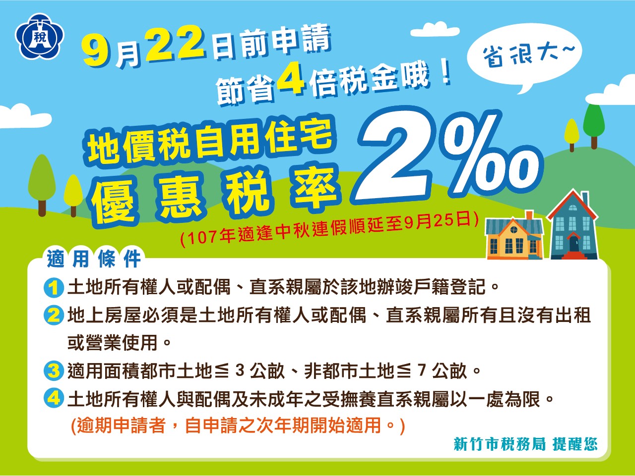 【本報訊】地價稅開徵在即,新竹市政府提醒您省錢小撇步! 新竹市稅務局今表示,地價稅將在11月開徵,如民眾欲適用自用住宅優惠稅率,應在開徵40日前提出申請,也就是9月22日,但今年因適逢中秋連假,申請截止日順延至9月25日,請購屋族多加注意,超過期限可要再等一年。