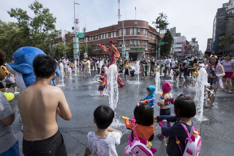 市府行政處說明,市府前廣場噴水池水質是經過殺菌、消毒,具備游泳池等級水質衛生,水源循環再利用,不浪費水資源,噴出的水壓是緩升、緩降,小朋友玩水很放心。