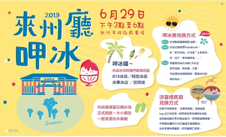 市府州廳前廣場每到夏天都會變身成為孩子們的「夏日水樂園」,因此,州廳前廣場從早到晚總是充滿孩子的歡笑聲,玩水的歡樂氣氛也感染經過的路人,位於市中心就可以讓小孩安全玩水讓許多父母感到十分方便;今年活動當天(29日)下午3點開始,現場有免費水槍給大小朋友玩水外,還有活潑的背景音樂、遮陽傘與桌椅供大小朋友休息使用。此外,今年更邀集在地4家知名冰品名店豆戀迷、阿忠冰店、814冰店、光華冰店來到現場設攤,一起同歡,要給市民帶來消暑又充滿歡笑的一個開心午後,當天大小朋友與現場活動指定看板拍照打卡並加入市府LINE@,即可獲得限量新竹著名冰品「呷冰券」一張!(總共800份,送完為止)。