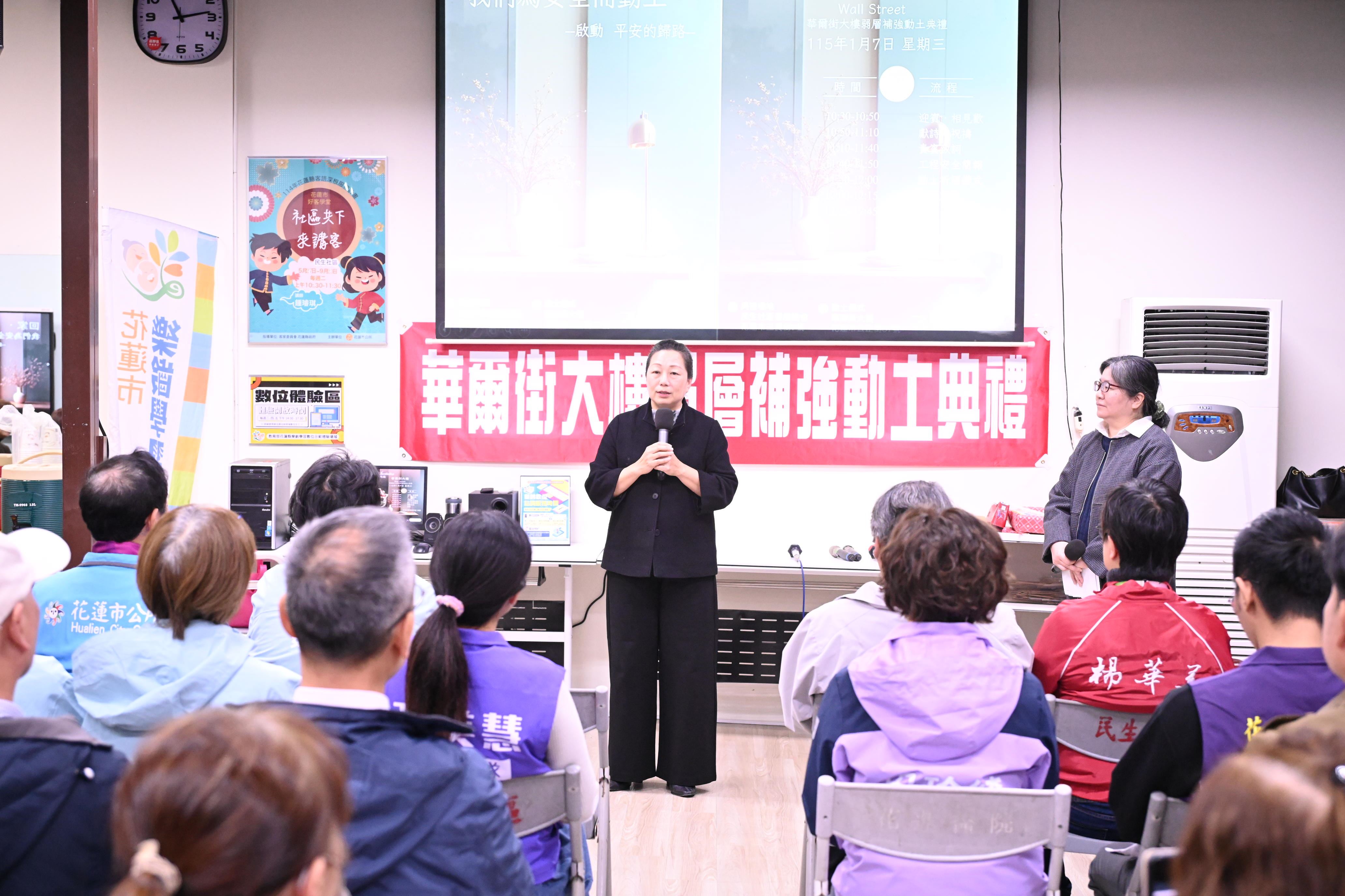 徐榛蔚縣長致詞表示,感謝華爾街住戶及各界的共同努力,讓工程得以順利進行。本案技術高度挑戰,補強過程可能涉及拆除牆面、擴柱影響坪數,已責成縣府及專業團隊,兼顧安全與權益。並表示重建期間啟動租金補貼等配套措施,每一分善款動支公開透明、供受各界檢視。徐縣長強調,無論是拆除重建、都更、弱層補強、安置到補助,每個環節都是縣府與中央、專業團隊及社會各界共同努力的成果,目的只有一個,就是讓每一位花蓮鄉親早日重返安居生活。