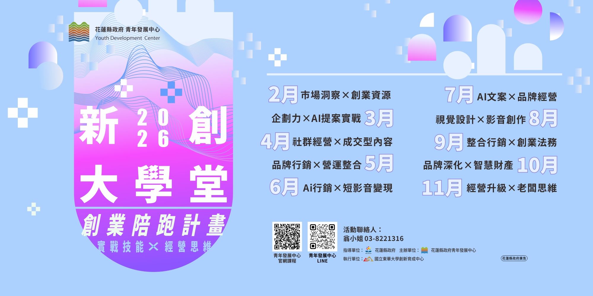 【本報訊】花蓮縣政府青年發展中心持續推動「新創大學堂」系列課程,長期協助青年創業者扎根花蓮、提升在地產業競爭力。2026年度課程正式啟動,整體規劃聚焦「創業知能、營運管理、電商行銷、科技應用」四大核心領域,採主題月與模組化課程設計,引導創業團隊從市場趨勢洞察出發,逐步深化品牌經營、行銷策略與營運韌性,強化創業實戰能力。所有課程免費報名參與,詳細資訊請洽官網https://ydc.org.tw/activity/course/list/