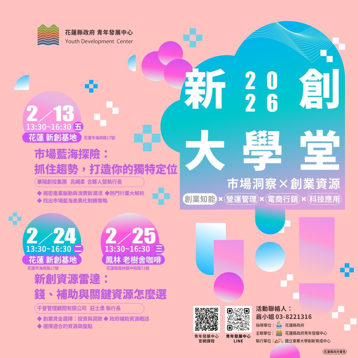 首波2月課程將帶領創業者精準定位並盤點關鍵資源。2月13日「市場藍海探險:抓住趨勢,打造你的獨特定位」,邀請華陽創投集團合夥人暨執行長呂緗柔擔任講師,將透過實戰拆解產業脈動與消費新潮流,帶領學員識別市場空白,制定差異化制勝策略。接續2月24日(花蓮場)與2月25日(鳳林場)舉辦「新創資源雷達:錢、補助與關鍵資源怎麼選」,由千督管理顧問有限公司莊士勇執行長主講,課程將深入解析投資、貸款與政府補助的差異與申請重點,協助學員盤點公司現況,了解不同階段適合運用的資金資源,找到解決資金需求的實用方向,讓創業之路更安心穩健。