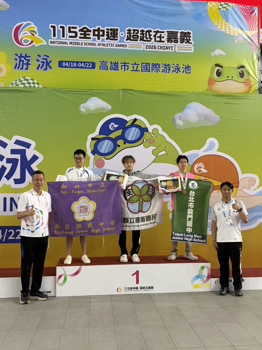 在游泳賽場上,國風國中顏上翔於國男組200公尺蝶式決賽中勇奪金牌,成為本屆賽事焦點之一。比賽過程中,顏上翔面對全國好手毫不畏懼,在開賽後維持節奏,並於最後50公尺關鍵時刻全力衝刺,成功奪得冠軍。