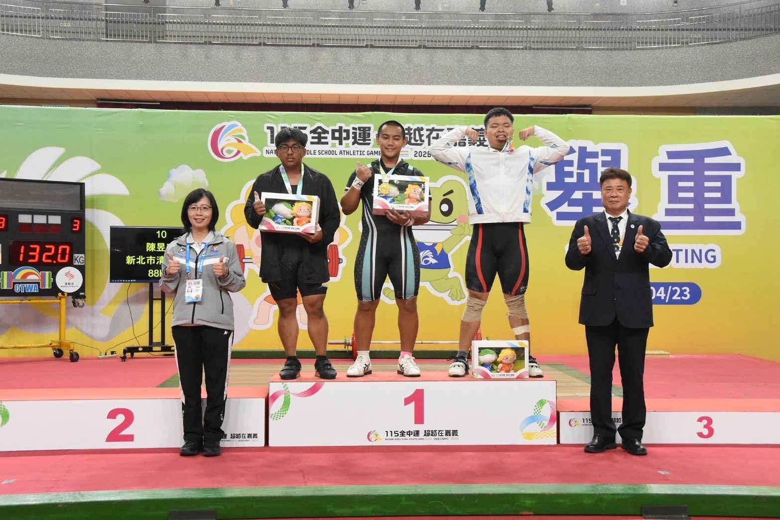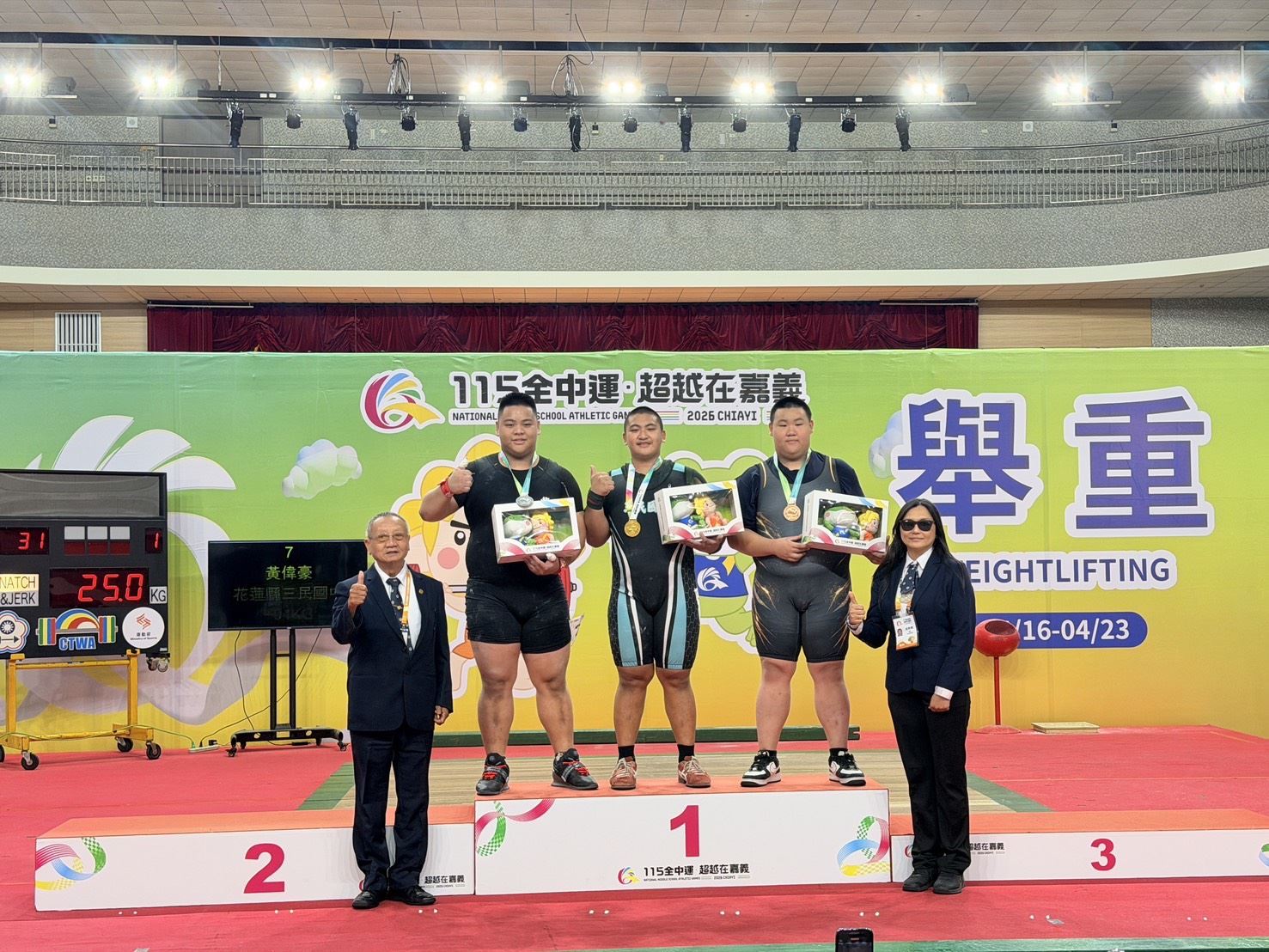 舉重賽場再傳佳音,一日2金1銀,三民國中舉重隊整體表現亮眼。來自卓溪鄉的布農族選手田君德,受哥哥影響投入舉重,卻在國二時因意外膝蓋骨折,歷經近一年復健低潮,在教練詹依燃陪伴下重返賽場,最終以抓舉100公斤、挺舉132公斤、總和232公斤勇奪國男組88公斤級金牌。另一位玉里觀音部落出身的黃偉豪,僅練習一年多即嶄露頭角,賽前卻不慎手腕受傷,仍咬牙上陣,最終以挺舉144公斤逆轉勝出,拿下94公斤以上級金牌,兩人以堅持不懈的精神寫下感人佳績。另在國男組79公斤級黃偉安則摘下銀牌。
