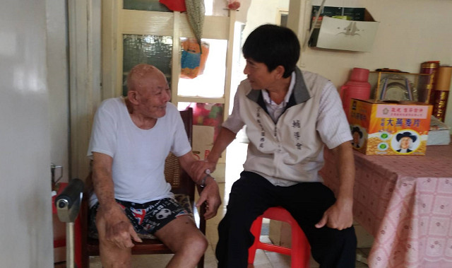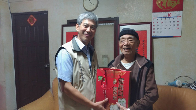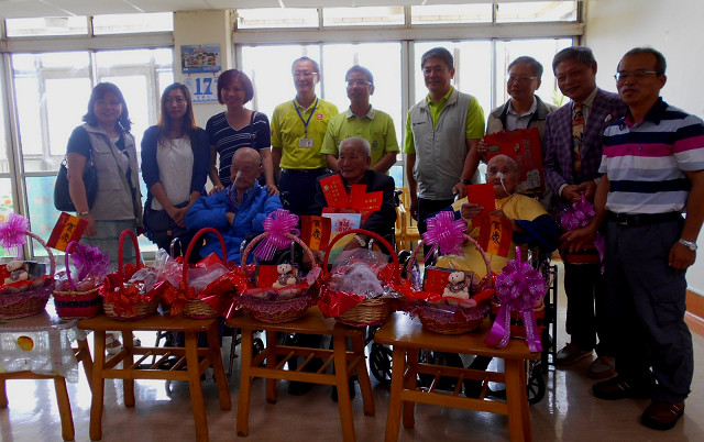 今年重陽節慰問對象中,有一101歲蕭伯伯,他在海軍服役期間,曾在家鄉娶妻生女、生活幸福,妻病逝後,因其須隨軍移防,即把女兒託付家人照顧,這一託付從此就斷了音訊,因思念家人殷切,在軍艦服勤時,不慎被粗大纜繩絞斷了左手臂而以傷兵退伍,退伍後落居宜蘭市,蕭伯伯雖斷臂,但仍意志堅定每日踩著三輪腳踏車,沿街叫賣棉花糖與叭噗冰淇淋,省吃儉用,幫助弱勢,為善不欲人知。