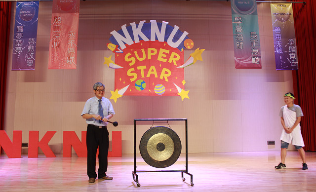 【記者于郁金/高雄報導】國立高雄師範大學106年新生定向共識營,於9月4日上午8時30分假活動中心2樓演藝廳辦理,整個為期3天的定向營活動課程,在校長吳連賞敲鑼後正式展開;今年訂定主題為「Superstar 星神話」,期待藉由多元、活潑、生動的活動,來進行各項新生定向輔導,課程內容涵括有志工訓練、防災演練、定向通關、社團博覽會及名人王政忠講座等;希望透過精彩的活動設計,幫助20個系的新鮮人認識高師大、融入高師大。