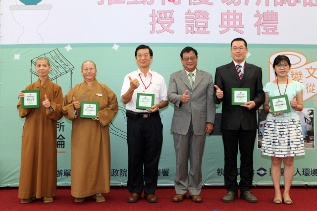 接著由張子敬副署長頒發包括高鐵臺南站、民航局臺南航空站、新光三越臺南西門和中山分公司等單位的特優公廁場所認證,佛光山和佛館則分別由如登法師、妙育法師代表上台領取獎牌和獎狀。