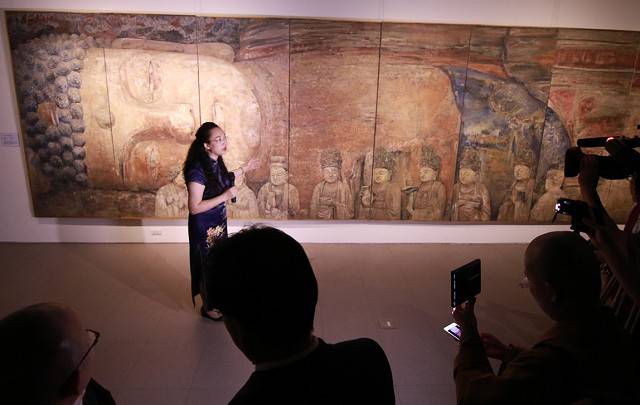 如常法師說,他一直想將石窟搬到佛館,李耘燕從南宋到唐代的石窟寺,以一比一的方式臨摹,採用丹培拉的技法,將石窟經歷的歲月完整保存。