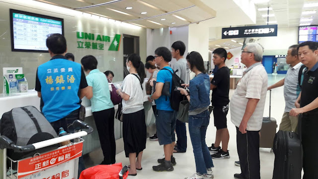 8日滯留高雄小港機場返金鄉親約有60位以上,有人夜宿機場,有人凌晨4點多就趕往機場填寫後補單;上午9時,遠航、立榮後補名單超過90人,現場由居住金門瓊林村蔡瑞鳳整合,願意等待加班機回金門家鄉的,已經超過60人;此時,經過金門楊鎮浯立委、金門縣政府觀光處陳美齡處長、陳玉珍議員、立榮航空高雄邵銀鎖主任、高雄李雅靜議員、立委楊鎮浯南區服務處主任蔡忠盼、吳昭鑾伉儷、高雄浯江金門同鄉會理事長楊維居、總幹事黃國田、常務監事陳美金等人在高雄小港機場協助處理飛金門加班機事宜。