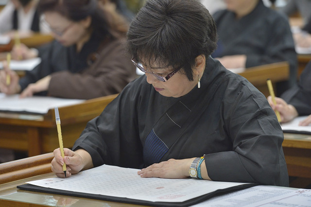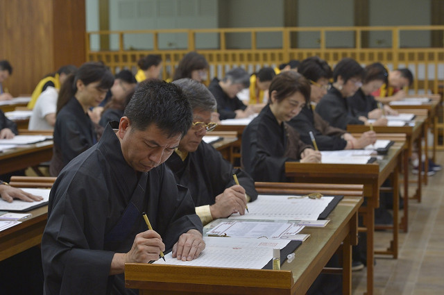 在法師的引導下,抄經活動安靜而莊嚴;特地從臺北來抄經的王芝祥,字體秀麗、行雲流水般抄寫經典。王芝祥說,抄經讓他身心安住,提醒自己的不足,修好自己的心,做比昨天更好的自己。