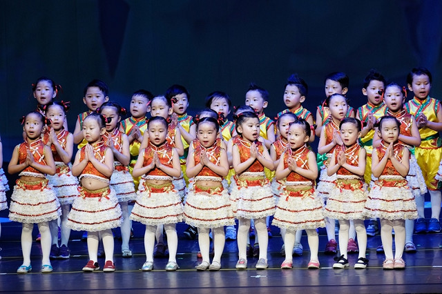 小天星幼兒園穿著閃亮服飾,手持竹板,排著可愛隊形,用自然地律動,配合竹板聲朗讀《弟子規》;隨後又拿出星星和雲朵的道具朗讀《星雲詩》,最後又唱又跳地演出《我愛歡喜》,真誠的笑容,將歡喜的心情播送全場。