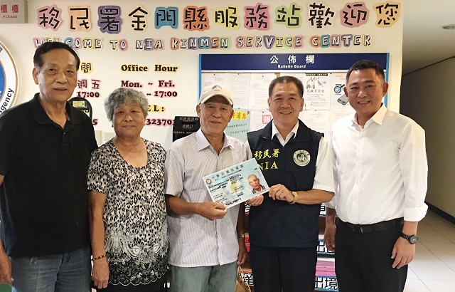 【記者于郁金/金門報導】終於落籍金門,一圓歸鄉夢的歐陽自由老先生5日下午在立委楊鎮浯與親友陪同下,前往移民署金門服務站領取居留證暨表達感謝之意。立委楊鎮浯表示,一年前接獲歐陽伯伯的陳情,經過多次與相關單位研商與協調,非常高興終於能夠讓歐陽伯伯回到他最深愛的故鄉金門,除了感謝移民署協助解決此一個案,同時也感謝移民署金門服務站專委陳祥麟找出辦法、解決問題,讓歐陽伯伯一圓長久以來的心願。
