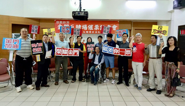 【記者于郁金/金門報導】金門博弈公投倒數2天,由於公投選情低迷,臺灣反賭博合法化聯盟與金門關心博弈公投的團體與人士於10月26日假金門救國團會議室聯合召開「倒數時刻,金門反賭場催票」記者會,現場高喊「榮耀金門、拒絕賭場;金門我的家,賭場遠離它」口號,呼籲關心金門前途的朋友踴躍到投票所投下「不同意」票。