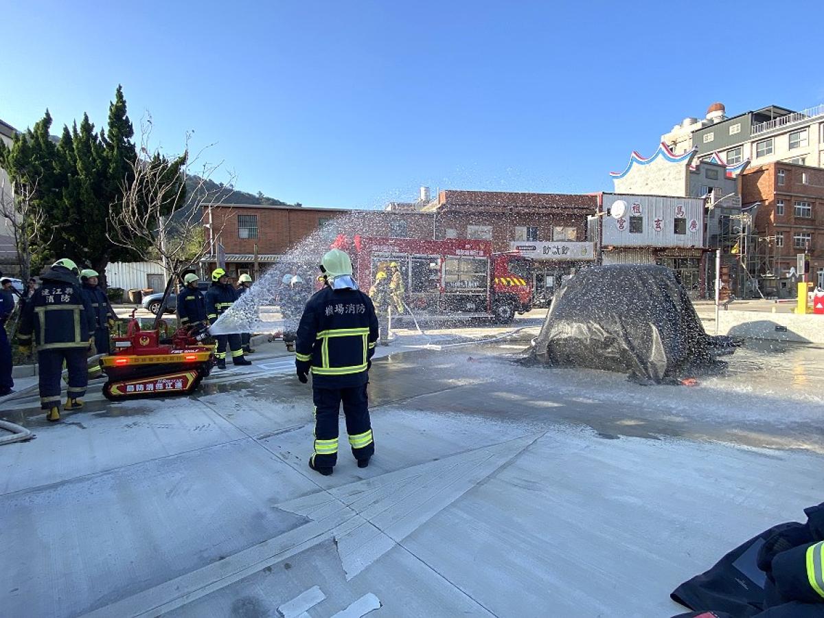 本次演練模擬車輛起火情況,由消防人員與義勇消防隊共同投入訓練,並出動消防機器人深入火源位置,協助水線壓制與火勢偵蒐,降低人員曝露於高熱濃煙環境的風險。演練中隊員與義消成員之間配合默契、動作迅速,展現火場協同作業能力,也作為義消常訓內容之一,有效提升面對各類火警時的應變與支援能力。