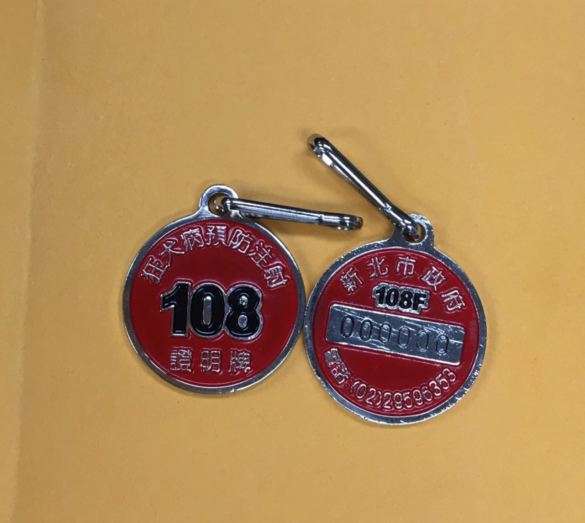 根據現行法令,狂犬病頸牌每年依序由綠、紅、藍、黃輪替,本年度輪到朱紅色犬牌,動保處特別要求製作廠商提升頸牌的製作品質。因為犬貓活動量大,可能有翻滾奔跑等行為,時間一久可能導致頸牌磨損或刻印的字模糊不清。為此,動保處每年在頸牌到貨後會進行頸牌表面耐磨度抽驗,測試其表面亮度和字是否清晰。在確認品質良好後,才將頸牌分配到有簽約的動物醫院或各動物之家,提供毛寶貝的爸媽在施打狂犬病疫苗後領取。頸牌不僅可以作為是否施打狂犬病疫苗的證明,更可以在犬貓不小心走失被路人撿到時,帶至鄰近動物醫院利用網路系統找到主人,減少寵物走失就找不回的遺憾。