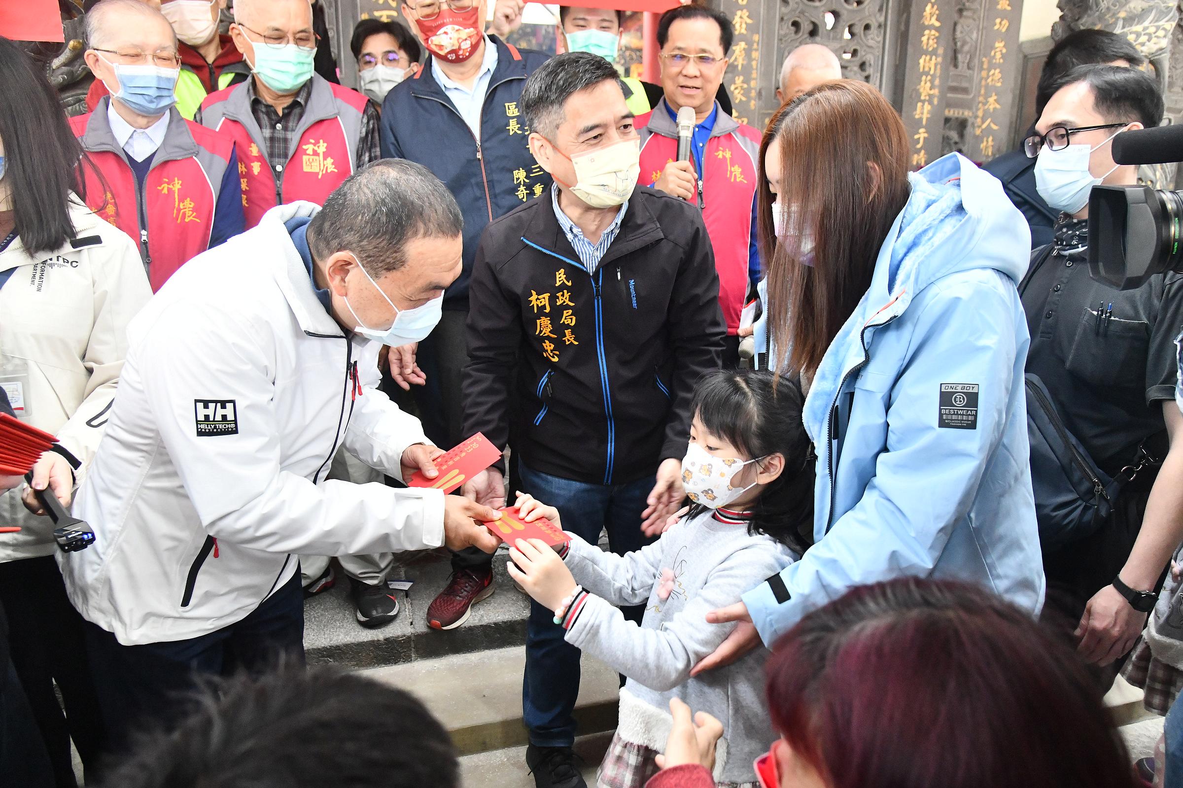 侯友宜參拜後發放福袋予市民,他解說福袋上的「兔吉利來」象徵在疫情過後,大家都健康平安,希望經濟能復甦、蓬勃起飛,讓民眾兔吉利來、鏟錢進來、錢你來鏟、你來鏟錢,以不同排列組合發音,富含吉祥寓意,望大家平安賺大錢。