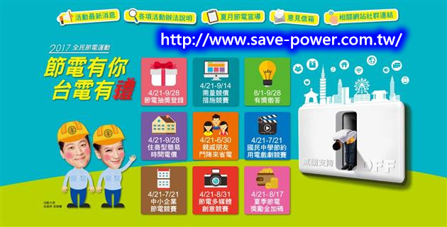 台電指出,全民節電活動除了抽獎外,在競賽類別中舉辦「國民中學戲劇競賽」、「中小企業節電競賽」、「親戚朋友鬥陣來省電競賽」,今年也首度新增「節電多媒體創意競賽」,分為「動畫類」與「非動畫類」類別,以「節約用電」與「住商型簡易時間電價」為主題,期盼匯聚群眾智慧,以創意發想、傳遞節約用電的重要性;其它完整活動資訊,歡迎前往活動網站(www.save-power.com.tw)查詢,及早報名參賽拿獎金。