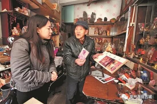 在另一家店舖裡,不時傳來古香古色的古曲,引起了記者的注意。這是一家佛雕老舖,一番詢問之後,方才得知這家老舖原來也有逾百年的歷史。店主詹芳環,今年已經83歲了,是佛雕第三代傳人。“這間百年老舖是我祖父詹復生於清光緒年間開設的。傳承到我父親詹振輝這代,還曾得到了德化名師許光益、泉州雕刻藝人姚松林以及民間妝佛師傅黃友澤的指點。1953年,我父親詹振輝被中央美術學院華東分院授以'名藝人'稱號,並於1959年調到浙江美術學院任教,作品《李時珍》還被送去參加了造型藝術展覽。同時,他還為江、浙、閩各大寺廟雕塑大型佛像。”詹芳環說。受父親的言傳身教,他從小便繼承了父輩的衣缽,獨當一面,把祖鋪辦得有聲有色。
