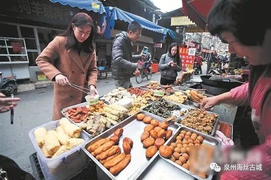 與記者探訪中山路的“95後”大學生小李,是老泉州人,但是,常年在外求學的她,已經許久沒有嚐到這般老味道了,“小時候,我的伯母就在壕溝墘擺炸料攤,一擺就將近二十年,那個時候我經常一邊吃著手上的炸料,一邊看著伯母在一旁包春捲……”她表示,這般難忘的味道在她上了大學後慢慢淡化。由於上學的城市在北方,她一年就只能回兩趟家,回來也就個把月,因為雜事匆忙,她很多時候已想不起自己從小愛吃的閩南炸料,而這一次她又重新愛上了這家鄉的味道。除了泉州人熟悉的炸料之外,這裡還有品類繁多的閩南特產糕點鋪,十分迎合咱厝人過年的傳統習俗需求。發糕、素食三牲、咸切糕、深滬冰餅、發財龜等各式各樣的糕點既美味可口又精緻惹人愛,這些也都是一些老泉州人過年的必備美食乾貨。