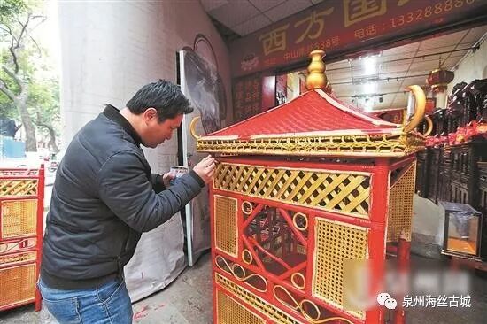 “在我們家,是從我爺爺就開始從事佛具工藝製作的,如今傳承到我這一輩,已經是第三代了。”蔡延年告訴記者。據他講述,最早的時候,爺爺的店開在甲第巷,一直到了父親這一輩,才搬來中山路新址。店鋪門口,擺放著兩乘正等待上漆的藤轎,大致的形狀已經初成,雖然尚未完工,但精緻的輪廓已可見。據蔡延年介紹,藤轎的起源要追溯到千年之前。古代的時候,藤轎是人們常用的代步工具。而如今的藤轎,又名神轎,通常用於民俗宗教活動中。