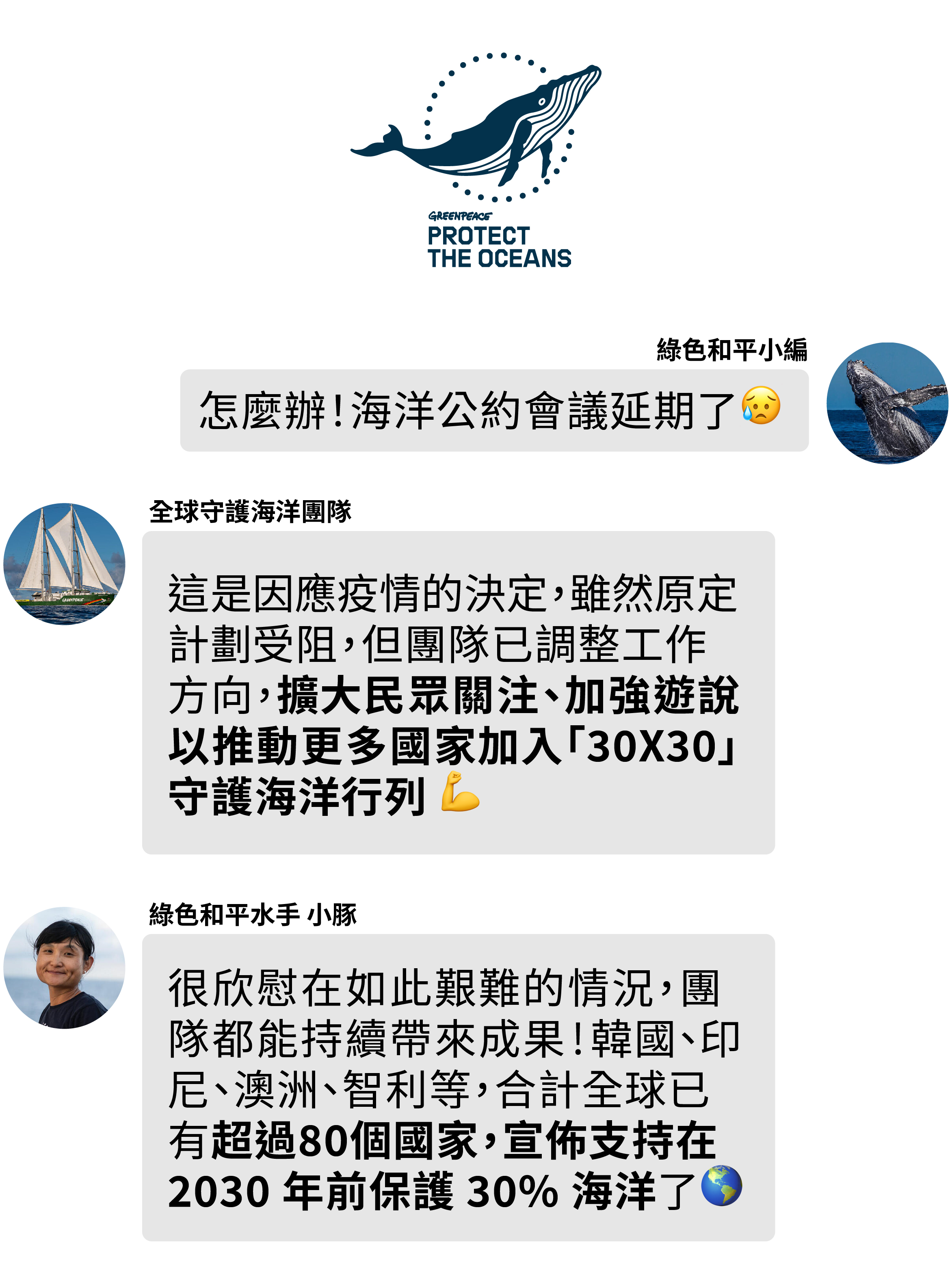 【本報訊】綠色和平原先訂於今年八月舉辦的全球海洋公約會議,因疫情延期。綠色和平守護海洋團隊正忙著商討後續規劃: