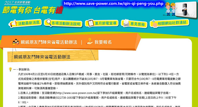 台電說明,為鼓勵更多人加入節電的行列,續推「親戚朋友鬥陣來省電」,用戶揪親朋好友共5戶(可跨縣市,以電號為單位),一起團「節」力量拼獎金,用戶也可以報名參加「省電行動家」,於6月30日前報名登錄,只要今年較去年同期省電2%以上,就有機會抽得節能家電提貨券。