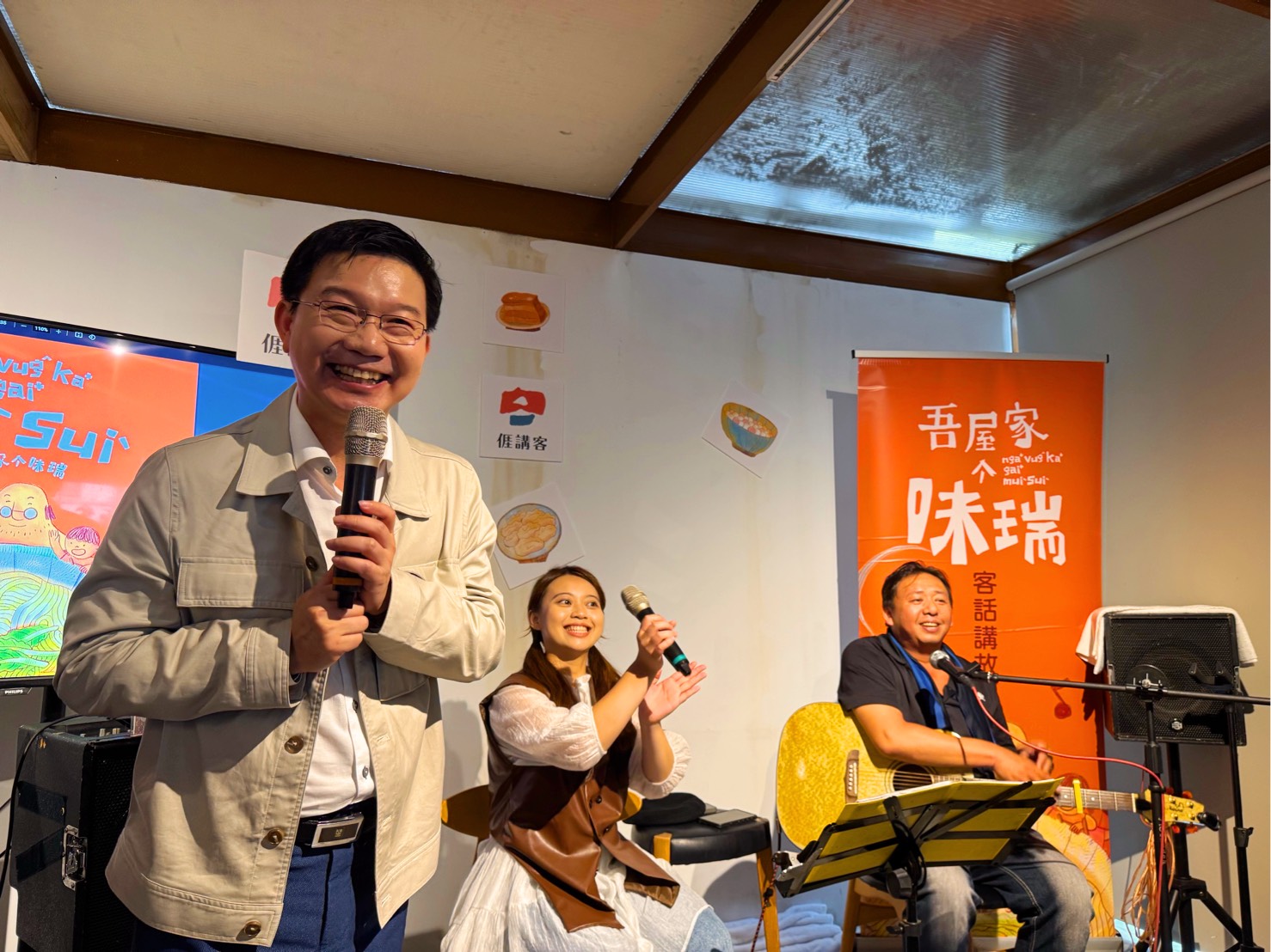 【本報訊】臺中市政府客家事務委員會6日下午在審計新村青創講堂辦理「吾屋家个味瑞-客家故事講唱會」,邀請東勢樂團「明哥菜車」以講唱方式,帶領現場親子聽客家故事、唱客家童謠,同時藉由繪本了解台中客家發展的故事。