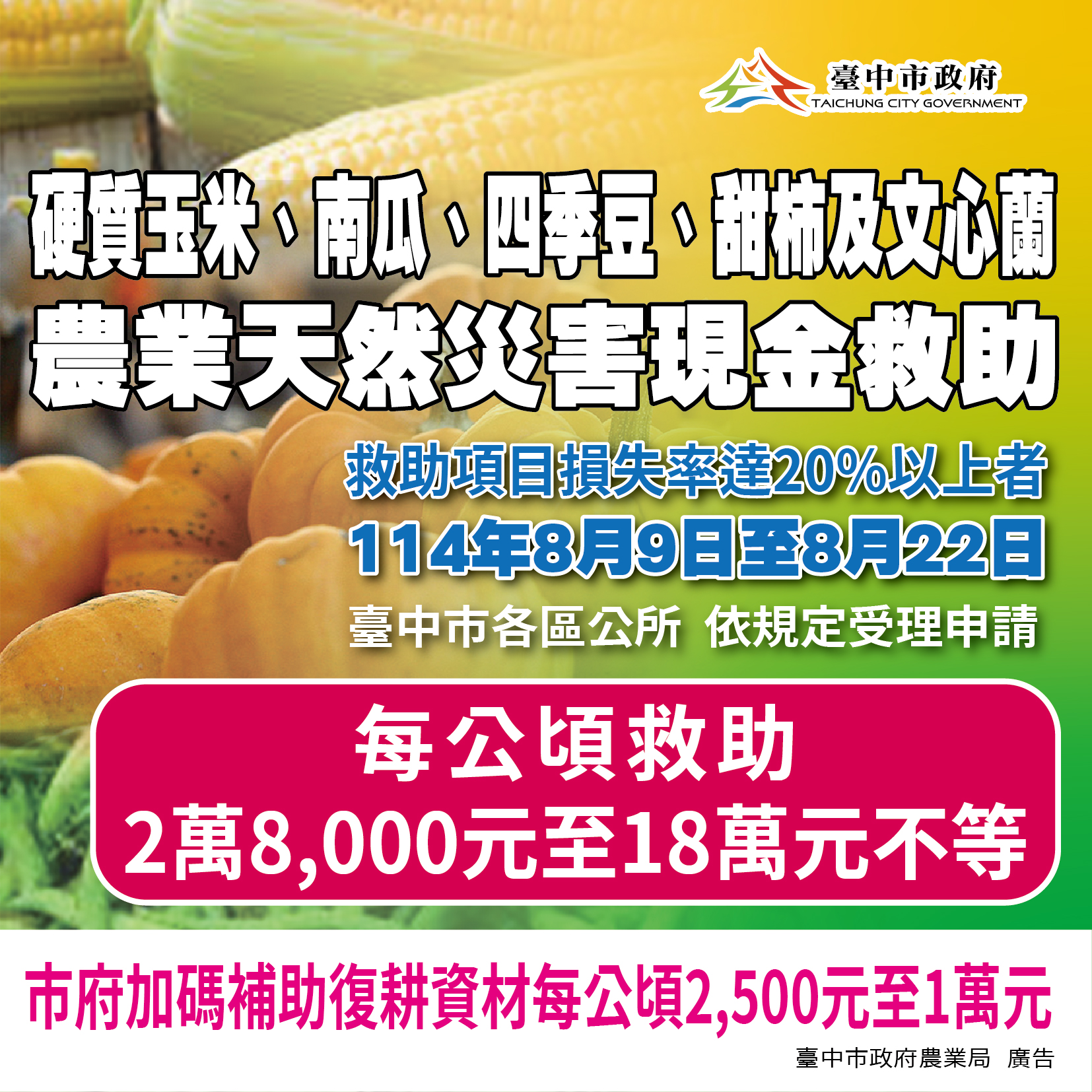 此外,除中央現金救助,台中市府依據「台中市農業災害復建補助作業要點」規定,另有實際復耕需求者,市府加碼補助復耕資材每公頃2,500元至1萬元不等,協助受災農民儘速復耕。