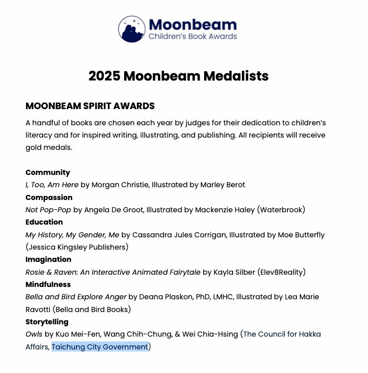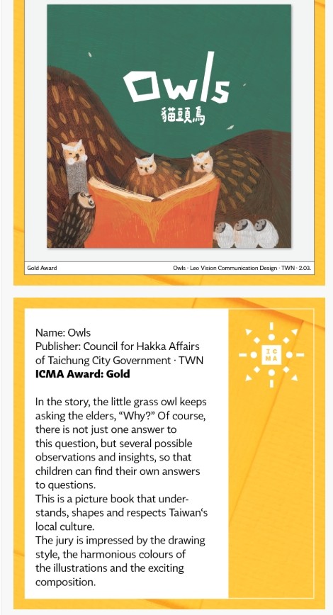 [本報訊]台中市政府客家事務委員會推動客語文化創作成果再傳捷報!客語繪本《貓頭鳥》以溫潤細膩的圖像風格與生動自然的客語文字,描繪台中山城客家重要祭典文化,成功打動國際評審目光,一舉榮獲德國「ICMA國際創意媒體大獎」書籍類兒童與青少年書籍金獎,以及美國「Moonbeam兒童圖書獎」2025年度評審金獎,成為少數同時獲得歐美國際大獎肯定的客語繪本,展現台中推動客語教育與文化創作的豐碩成果,也讓台中客家故事正式走向世界。