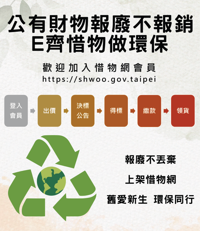財政局說明,「惜物網」自103年起由市府採行政委託方式,與台北市政府合作推動,將各機關學校分散處理的報廢財物集中上架拍賣。從拍賣公告、競標到決標結果,全程線上公開作業,資訊清楚可查,不僅強化公有財產管理透明度,也有效降低行政成本。