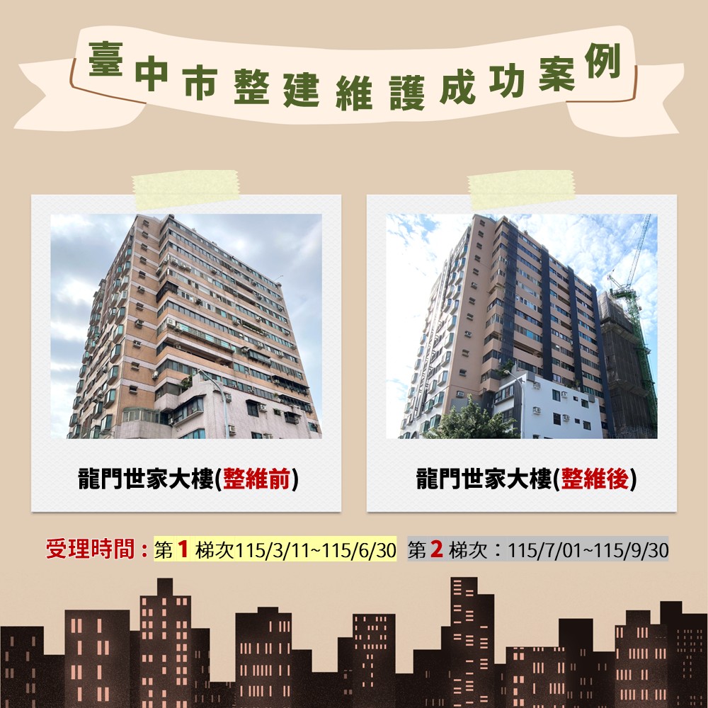 [本報訊]為鼓勵台中市民眾進行老宅外牆及外部環境整建維護,台中市政府都市發展局今年編列1,000萬元預算,補助都市更新案規劃設計及實施經費,歡迎有需求的民眾踴躍提出申請。今年都市更新整建維護補助分2梯次受理,第1梯次從即日起至115年6月30日止;第2梯次自115年7月1日至115年9月30日止,各梯次受理期間如補助預算經核准用罄,將公告停止受理,因補助經費有限,呼籲市民即早申請。