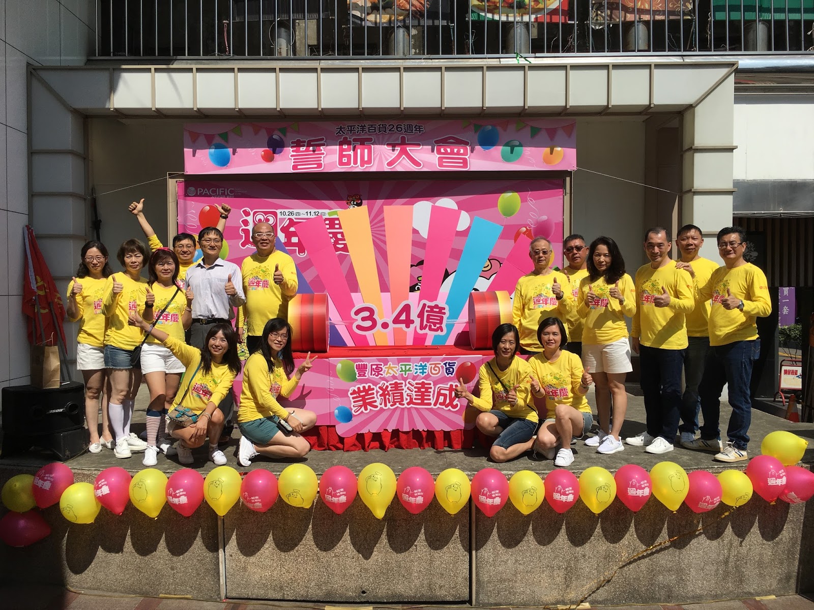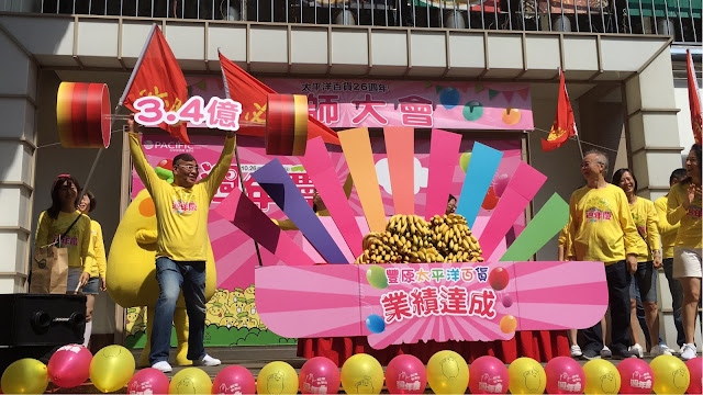 百貨公關廖美雅表示:「太平洋百貨承襲日本百貨業的know how,年年週年慶前都會特地舉辦誓師大會給同仁加油打氣,並藉著趣味的遊戲增進團隊默契,週慶前搏個好彩頭!今年還特別和香蕉人合作,香蕉人為臺灣原創line貼圖,擁有百萬下載量,香蕉人不只胖萌還很有親和力,更是全家人都愛的圖像,此次10月被預先曝光時顧客給我們的反應也十分熱烈,可預期週年慶業績和香蕉人身材一樣肥滿肥滿的。」
