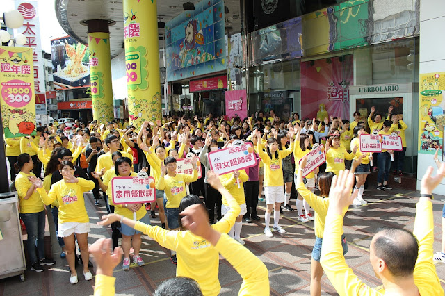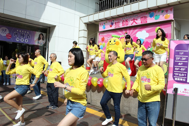 10月19日(四)上午首場9時30分,太平洋百貨員工及櫃姐紛紛於廣場集合,現場約聚集500位員工,活動由百貨主管跳香蕉人舞蹈開始,清一色穿上黃T牛仔短褲搭配長襪,在台上賣力賣萌,帶領台下的員工一起大跳香蕉熱身,緊接著展開趣味遊戲,考驗每個部門平時的團隊默契,最後再以甩肩舞象徵甩掉不景氣,再打開週年慶禮金光閃閃物盒,再造佳績!