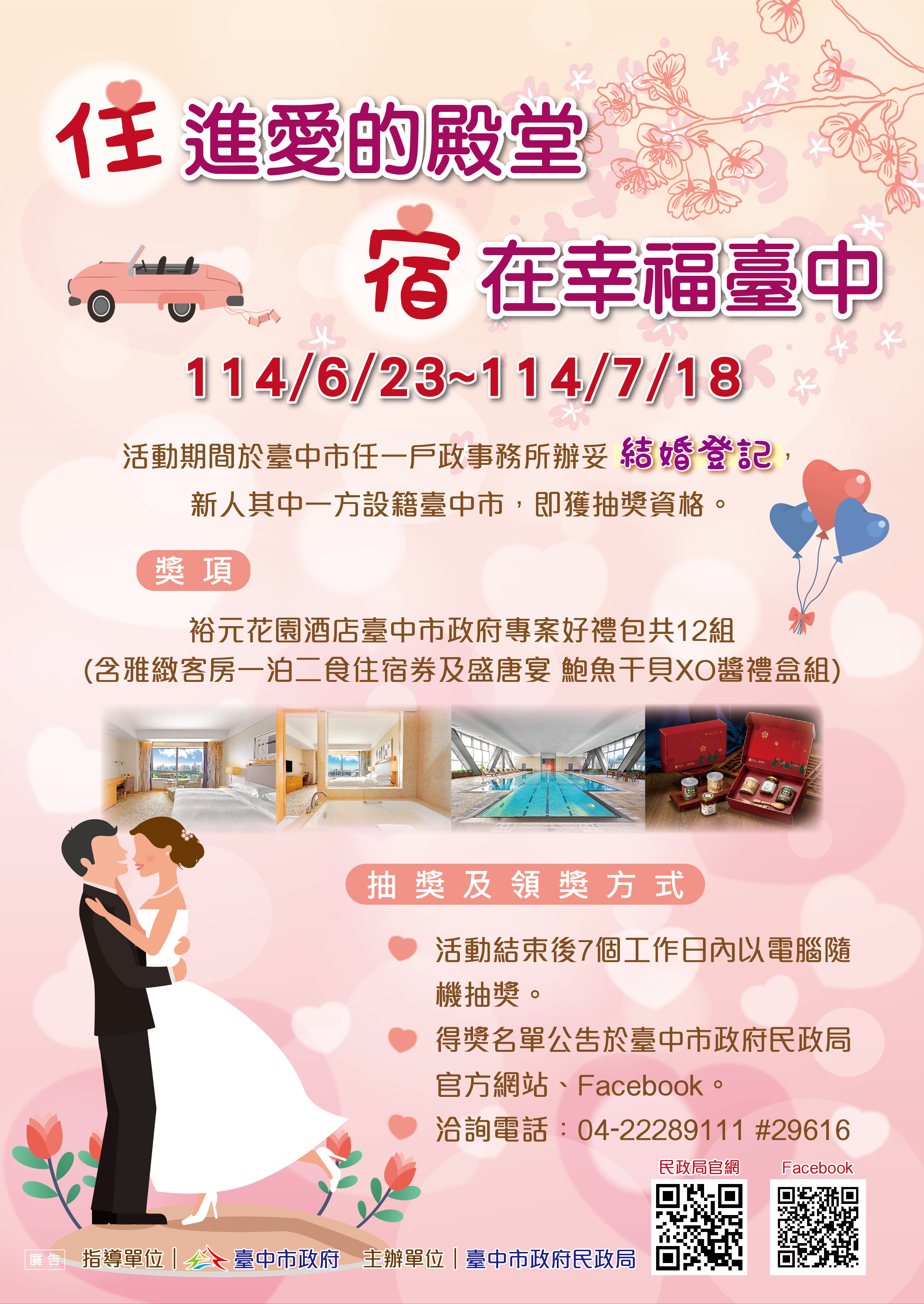 民政局表示,歡迎互許終身的幸福佳偶把握機會,幸福成家幸運中大獎,活動相關資訊可至民政局官網( https://www.civil.taichung.gov.tw/ )或臉書粉絲專頁( https://www.facebook.com/civilQ )查詢。另,民政局官網整合全市29個戶所(含辦事處)結婚拍照牆資訊( https://pse.im/7qb6nw ),提供想結婚的新人朋友參考,讓新人拍照時更加幸福閃耀。