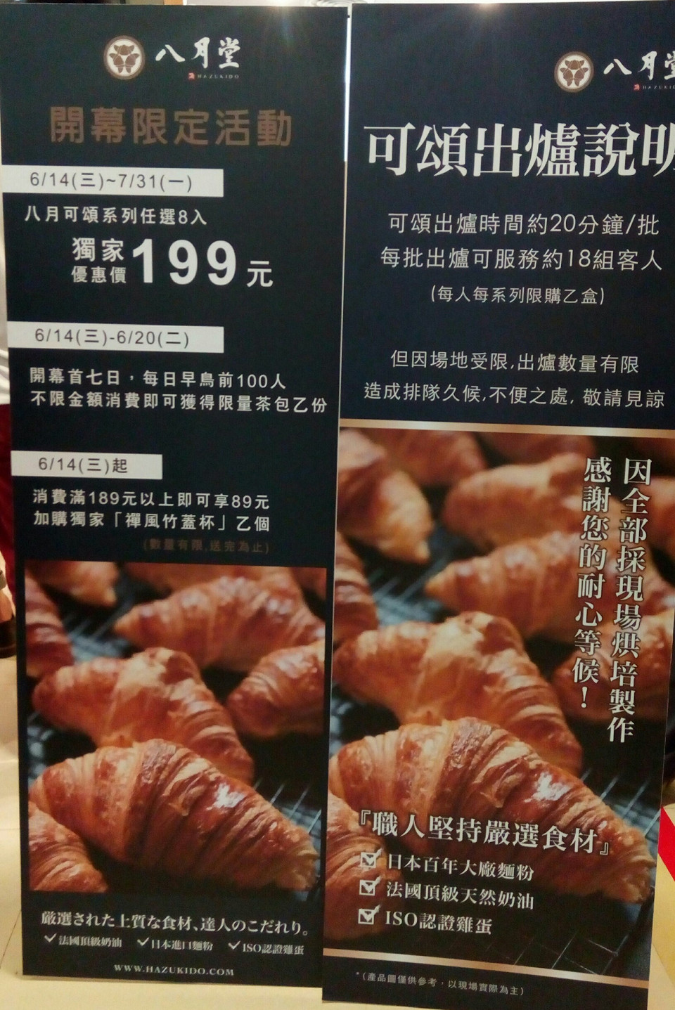 臺南府城是眾所皆知的美食薈萃之地,因此,「八月堂」選擇臺南做為開拓南部市場的首站,讓南部朋友近距離品嚐殿堂級可頌的魅力!新光三越台南中山店行銷企劃王映涵表示,為慶祝八月堂南部首店開幕,6月14日(三)至6月23日(五)開幕首7日不限金額消費,即贈送限量茶包乙個,單筆消費滿189元以上,即享89元加八月堂獨家「禪風竹蓋杯」乙個,數量有限,售完為止,除此,7月31日(一)前購買八月可頌系列,任選8入即享199優惠價。