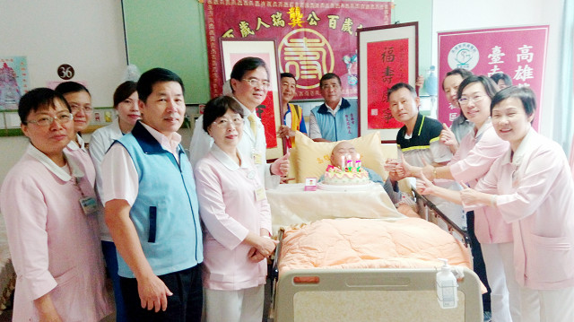 【記者于郁金/臺南報導】「家有一老,如有一寶」!高雄榮總臺南分院與臺南市榮服處攜手為入住在呼吸照護病房龔金發爺爺慶祝百歲生日,6月14日壽誕活動由院長王志龍與處長何興隆代表轉贈總統蔡英文、行政院長林全祝賀壽屏,同時也代表輔導會主任委員李翔宙贈送壽桃金鍊、生日蛋糕祝壽,陪同還有永康區復興里社區發展協會理事長吳秋明及龔金發爺爺友人,大夥與醫護人員圍著龔金發爺爺,齊唱生日快樂歌。