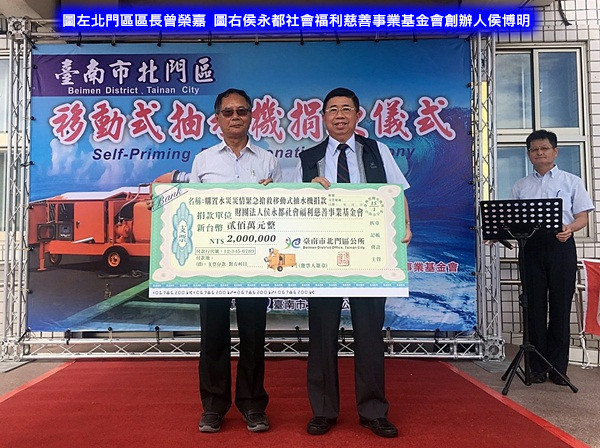 【記者于郁金/臺南報導】台南紡織公司、南紡購物中心董事長,兼財團法人侯永都社會福利慈善事業基金會創辦人侯博明,得知臺南市北門區長年飽受淹水之苦,本於企業回饋家鄉的理念,22日以侯永都社會慈善事業基金會名義,捐款200萬元購置移動式抽水機,將讓北門區水災緊急搶救設施更加完善。