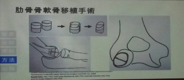 以往治療肱骨小頭分離性骨軟骨炎,僅止於移除已剝離的軟骨組織,病人術後大多無法重返球場,被迫放棄熱愛的棒球運動。柯伯彥醫師說,肋骨骨軟骨移植手術,在日本行之有年,他獲武田獎學金的贊助,於2014年特別到日本慶應義塾大學醫院學習此項治療技術,目前已完成3例手術,其中2位病人已重返球場投球,另1位也已開始接受投球訓練,3人運動過程中,皆無任何肘關節或胸廓不適的情況。