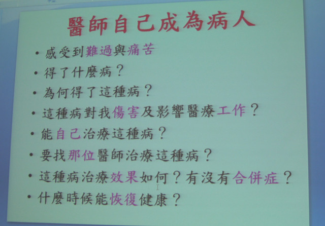 教授吳明和醫師以詼諧的口吻,帶領聽眾對課程的專注力。吳明和分享說,自己當病人的心路歷程與感受;自16歲起迄今73歲,前後歷經11次大大小小的手術;做為一個病人,最怕「被診斷不正確」;他有次頭痛欲裂到痛不欲生,歷經醫師檢查後,以為牙齒問題,被拔了好多顆牙齒,最後才檢查出是冷氣引發「中鼻甲肥厚及鼻竇阻塞」惹的禍!而身為一位醫師,正確的診斷病因,對病人最重要。