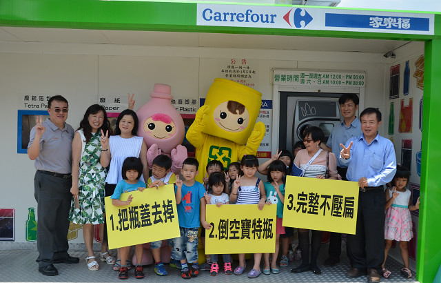 【記者于郁金/臺南報導】臺南市政府環保局在中華西路家樂福量販店設立全國首座大型資源智慧回收站,啟用半年來成效斐然,為使資源回收觀念向下札根,7月6日舉辦幼稚園學童正確投擲寶特瓶宣導活動,環保局主任秘書黃瑞恩帶領幼童,將寶特瓶等回收物分類,並投入正確的投入口,鼓勵幼童要將生活中的資源回收物正確分類回收,長大後成為環保尖兵。
