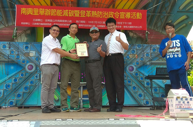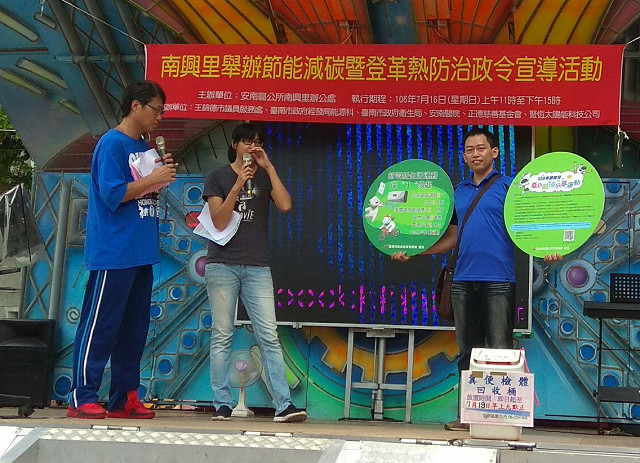 【記者于郁金/臺南報導】炎炎夏日進入用電以及颱風季高峰,南市南興社區為提升民眾環保意識,於7月16日(日)上午11時在安南區南興社區活動中心與臺南市政府經發局、安南區衛生局、安南醫院共同舉辦「節能減碳繼暨革熱防治宣導活動」,現場除展示節能燈具與環保電動機車,還有在地食材素食體驗,透過寓教於樂傳達環保永續的理念。南興里長施柏男表示,環保意識要從小扎根自生活中做起,希望從社區做起推展到全世界,共同愛惜地球。