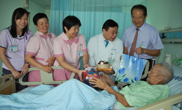 【記者于郁金/臺南報導】成大醫院轉到郭綜合醫院合作病房住院治療的病友,81歲侯貴春經醫護人員的細心照護下痊癒,日前在院方的祝福下出院,成為兩院合作病房治癒第一位出院的病友。