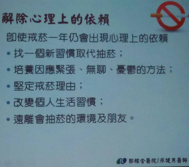 戒菸三不四要:不帶菸、不買菸、不抽伸手菸;嚼口香糖,喝開水,做運動以及尋求醫護人員協助。