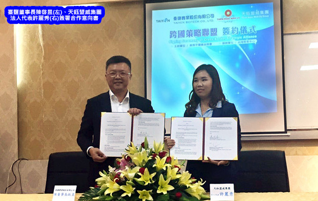 臺鹽董事長陳啓昱、天鈺盟威集團法人代表許麗秀近日簽署合作意向書,建立策略聯盟;天鈺盟威集團將引進臺鹽公司的優質保養、保健品進入越南市場;而臺鹽的保養、保健品歷來獲獎無數,獲越南通路商天鈺盟威集團青睞,引進越南市場。