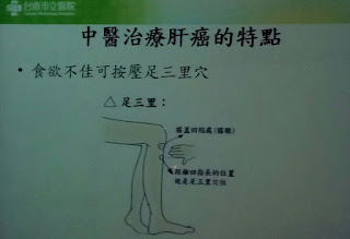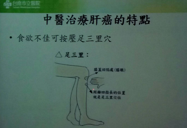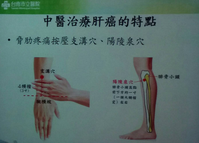 肝癌的許多症狀與腸胃道問題有關,從腸胃調理以提高「正氣」為首要的治療方法;健脾理氣的黨參、黃耆為主方,搭配活血化瘀、清熱解毒的川芎、夏枯草、茵陳等中藥,並依癌症的早中晚期分別給藥;此外,郭祐睿也建議搭配穴位治療,食欲不佳可按壓足三里穴,脅肋疼痛按壓支溝穴、陽陵泉穴等。