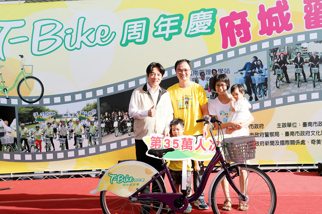 祥獅獻瑞揭開活動序幕,市長賴清德頒獎感謝T-Bike的第35萬人次使用者謝先生一起共襄盛舉!賴清德親自簽名,感謝謝先生一家人的支持。謝先生表示,T-Bike已經是他生活中的代步工具,除了交通使用,也是家人間的休閒活動,他以市民卡租借竟獲得第35萬人次使用者腳踏車大獎,實屬意外!