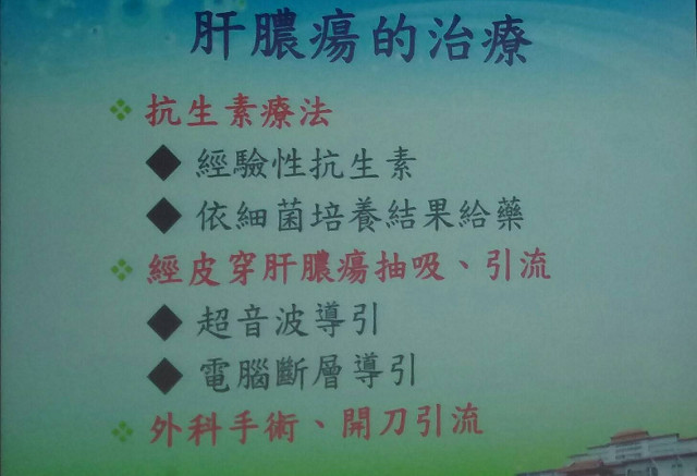 李致毅醫師表示,肝膿瘍如果沒有接受適當的治療,其死亡率相當高,敗血症乃是其主要的死亡原因;它的治療目標有二,第一是肝膿瘍本身的治療,第二是消除感染源;原則上,當診斷確立後,應先給予適當的抗生素療法,如果病況允許,經皮穿肝膿瘍引流也要同時或儘早進行;臨床經驗告訴我們,有效的引流可以改善且縮短病程,並經由此動作獲得膿液培養之細菌學報告,進而協助臨床醫師選用有效且適當的抗生素來治療患者。