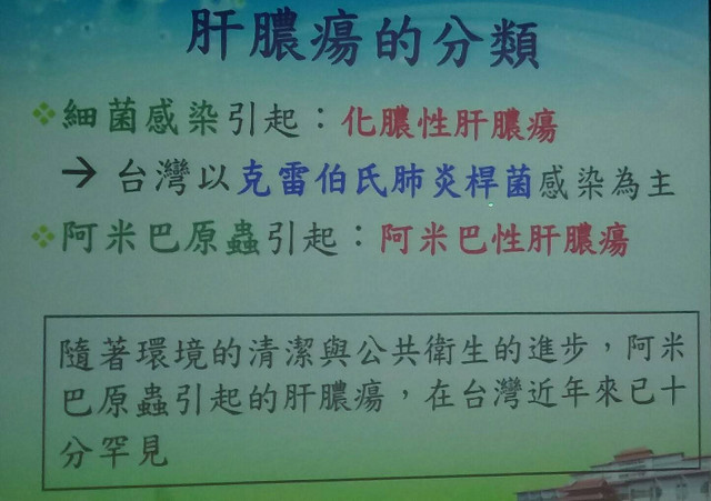 李致毅醫師表示,其實肝膿瘍並非一個罕見的疾病,可分為由細菌感染引起的化膿性肝膿瘍及阿米巴原蟲引起之阿米巴性肝膿瘍;阿米巴原蟲引起的肝膿瘍,隨著環境的清潔與公共衛生的進步,在臺灣地區近年來已十分罕見,因此,目前臨床所見肝膿瘍的案例大多以化膿性肝膿瘍為主;由於肝臟本身沒有痛覺神經,當發炎甚至有囊泡、膿瘍發生時,患者可能僅出現輕微發燒、頭痛、全身倦怠等類似感冒、非特異性的症狀;目前成藥種類眾多且取得容易,若患者僅僅藉由成藥來緩解發燒、身體不適等症狀,往往會延誤就醫而錯過治療的黃金期。
