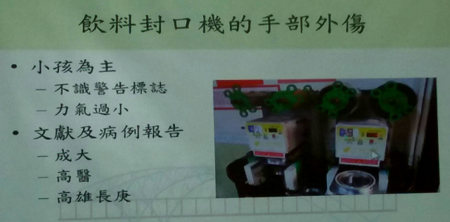 洪國書醫師指出,隨著茶飲店以及早餐店的數目越來越多,飲料封口機變成隨處可見的機器;雖然機器的安全設計不斷在改進更新,但是因為封口機造成的小兒手部外傷,依然時有耳聞。