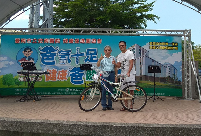 為使健康檢測和宣導工作更貼近民眾,臺南市立安南醫院將醫療服務搬進社區,8月20日周日上午在永康區)舉辦「爸氣十足、健康爸關-健康促進園遊會」,永康區區長王峻明、議員林宜瑾、鹽行里長盧文良、鹽洲里長毛三寶帶領里民熱情參與。活動會場共吸引逾400名鄉親攜家帶眷共享健康,除了接受安南醫院醫師群專業檢測與衛教外,並有闖關摸彩遊戲活動寓教於樂。家就住在永康區的林小姐抱回最大獎26吋雙避震自行車。她先生分享說,安南醫院就在自家的生活圈內,一家大小的健康都有安南醫院守護著,覺得很幸福。